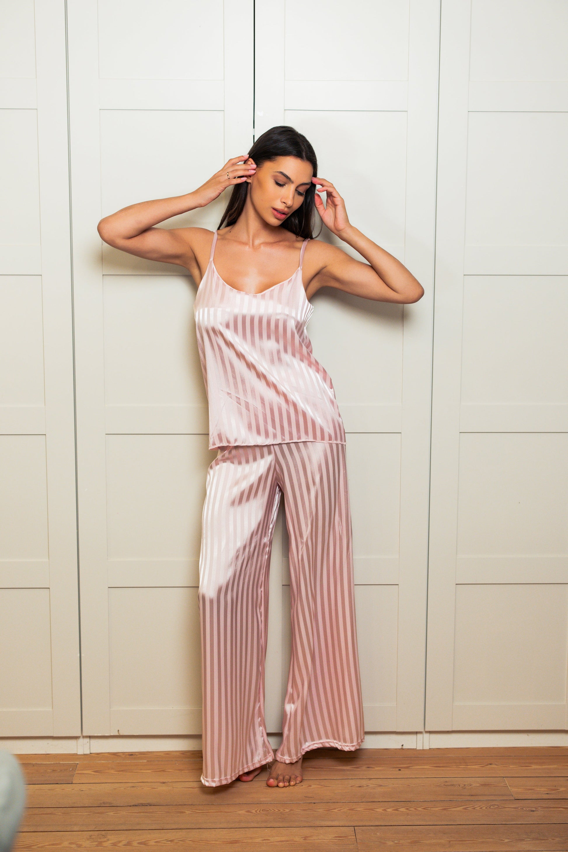 Donji deo izrađen od satena pruža luksuzan izgled i osećaj na koži. Sa širokim krojem i elegantnim prugama, idealan je za one koji žele udobnost i stil u isto vreme.