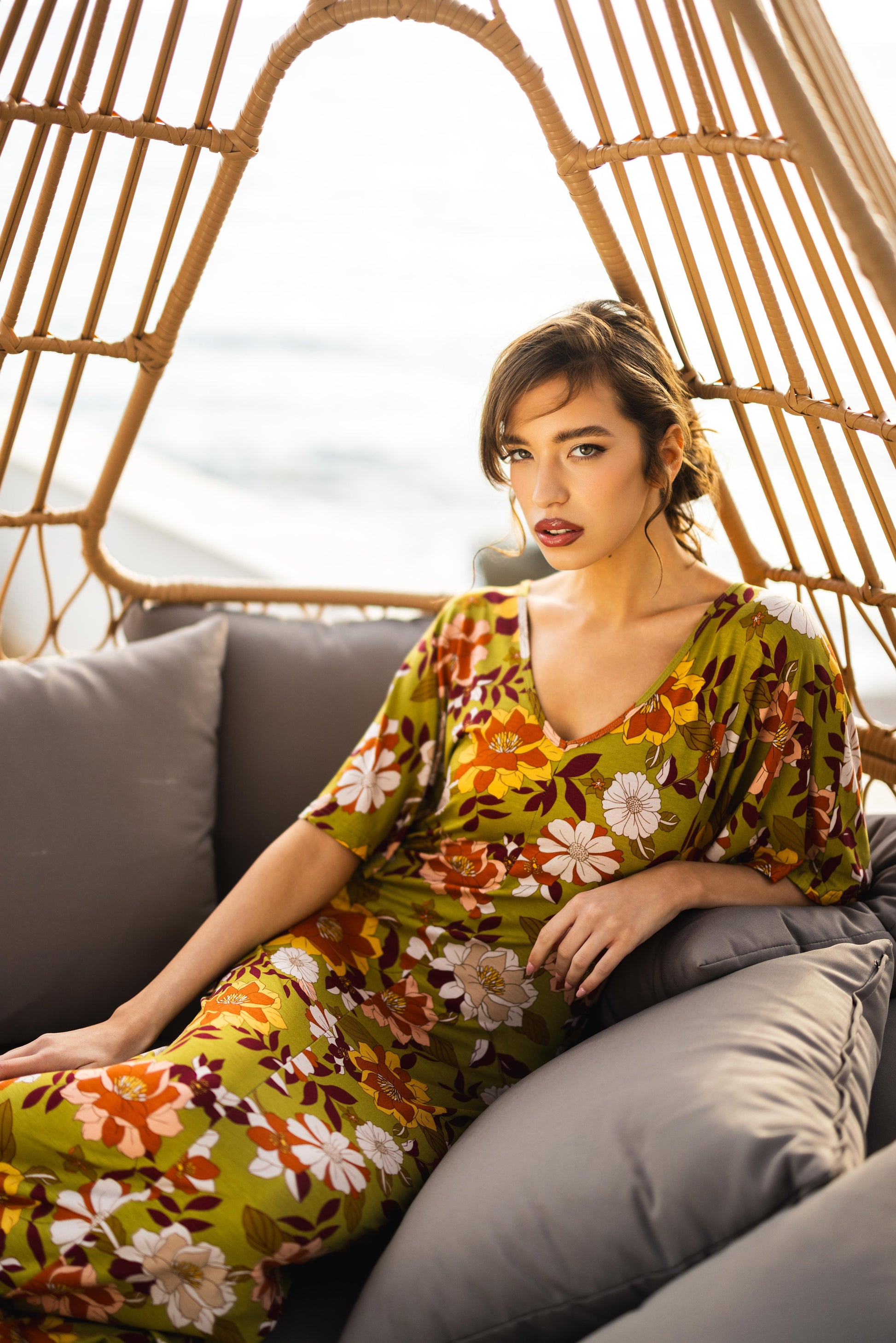 Haljina koja donosi osećaj leta u svaki korak – lagana, prozračna i elegantno lepršava. Idealna za dane kada želite da se osećate udobno, ali i primećeno. V-izrez i široki kimono rukavi daju notu ženstvenosti, dok elastičnost materijala prati liniju tela bez stezanja. Može se nositi na ravnu obuću za opuštene trenutke ili uz sandale i aksesoare za večernji izlazak.