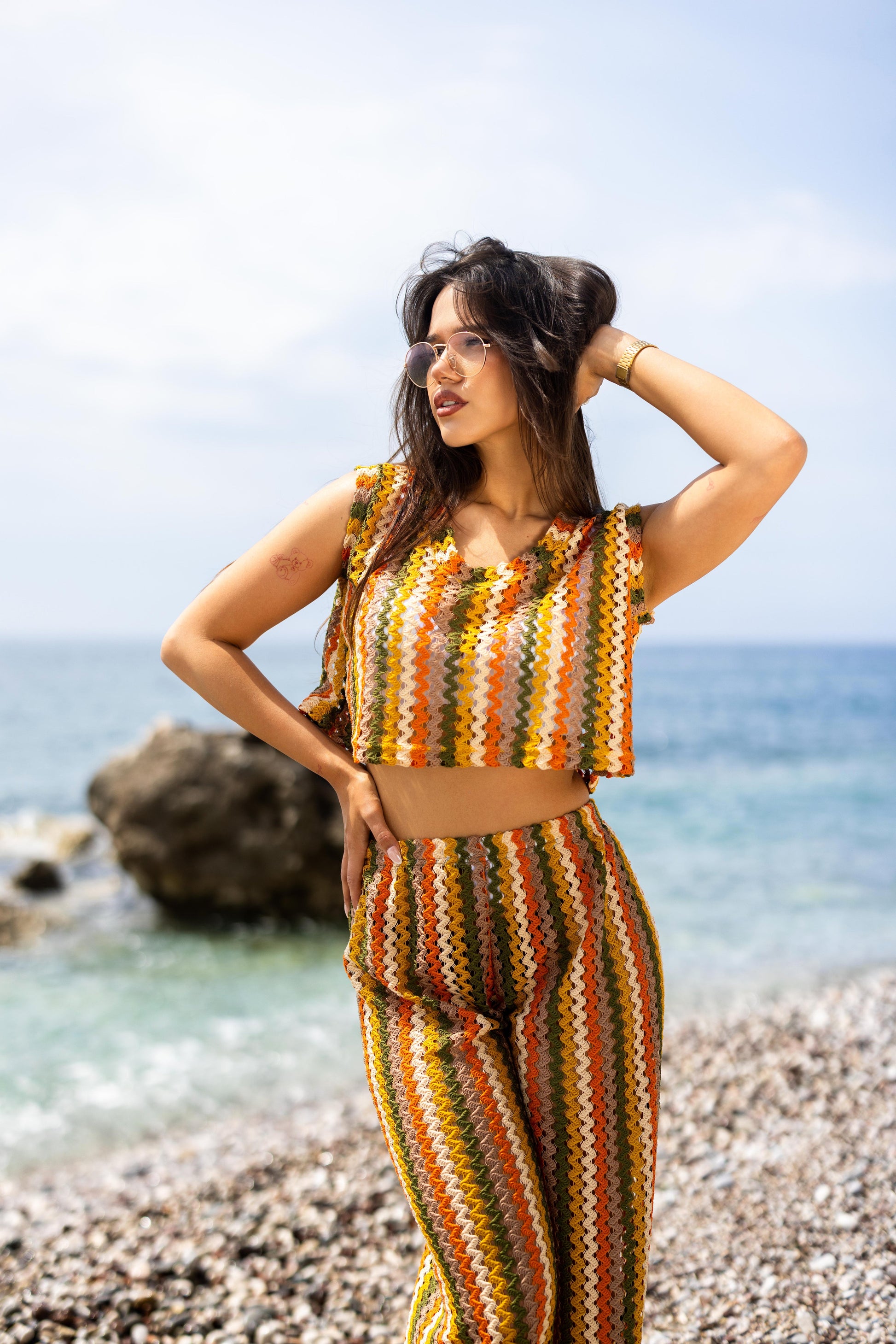 Lagani letnji top koji diše sa tobom. Upečatljiv zig-zag dezen i prozračna tekstura ga čine savršenim izborom za plažu i šetnje pored mora.