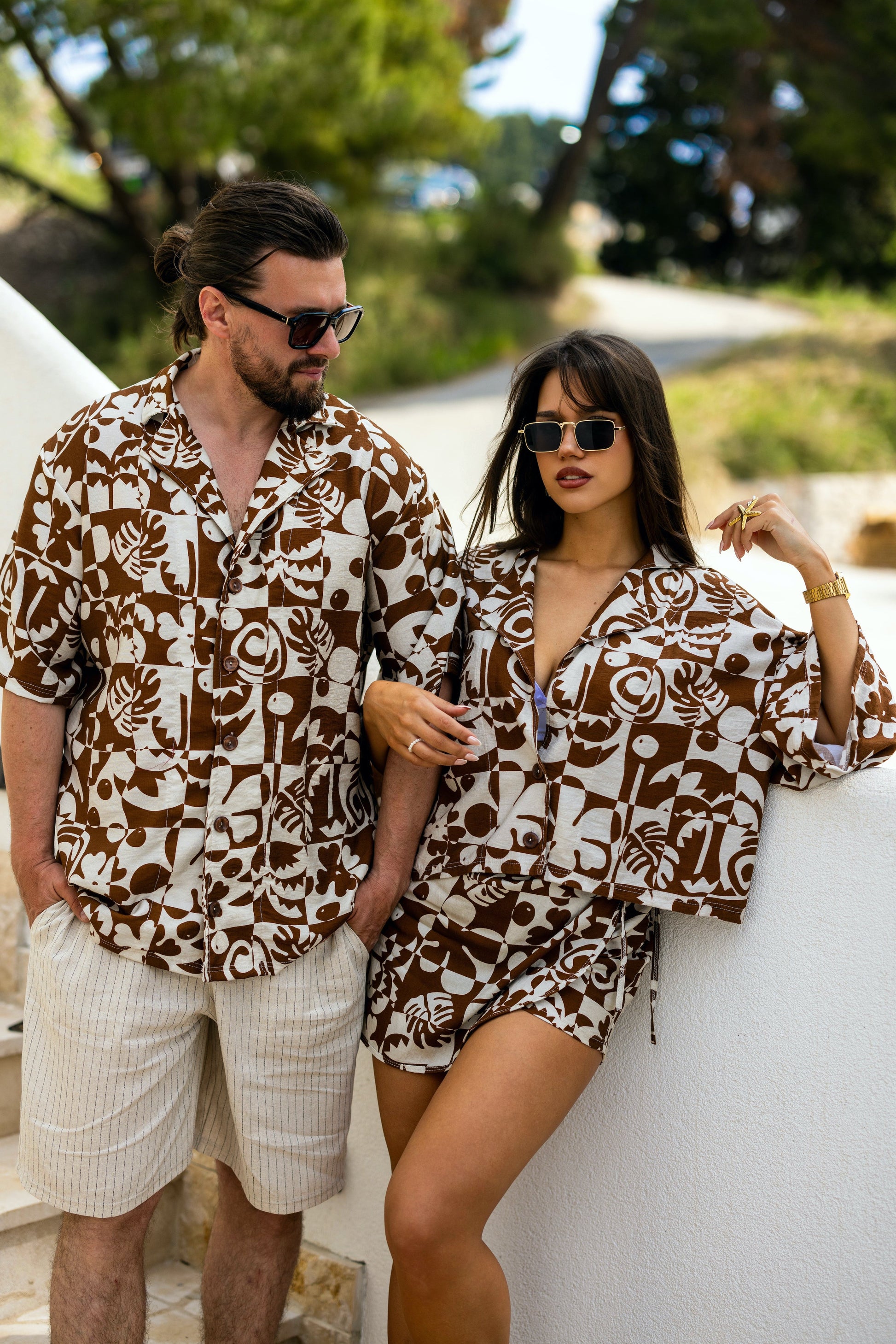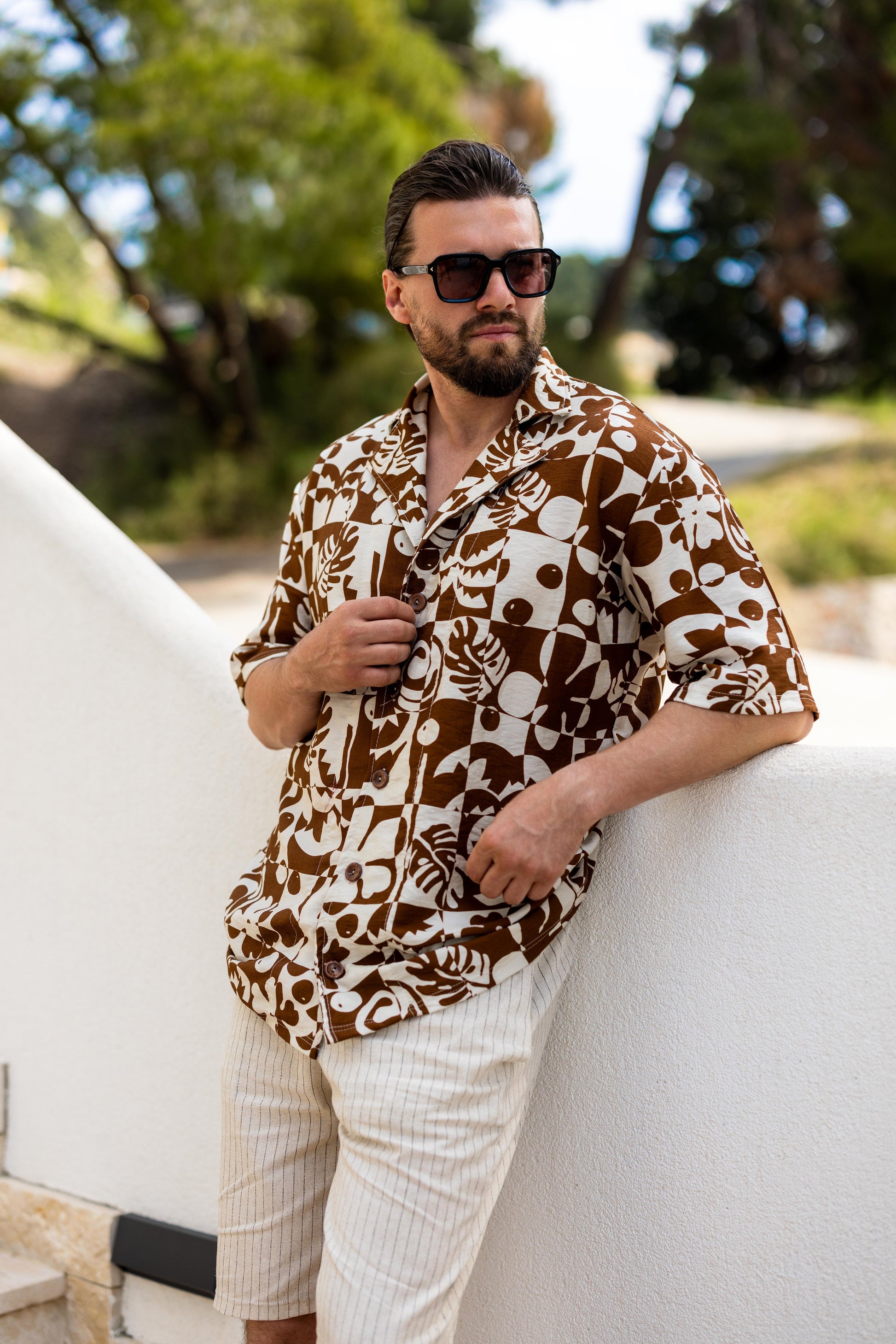 Geometrijsko-botanički print u zemljanim tonovima unosi karakter i prepoznatljivost bez napora.