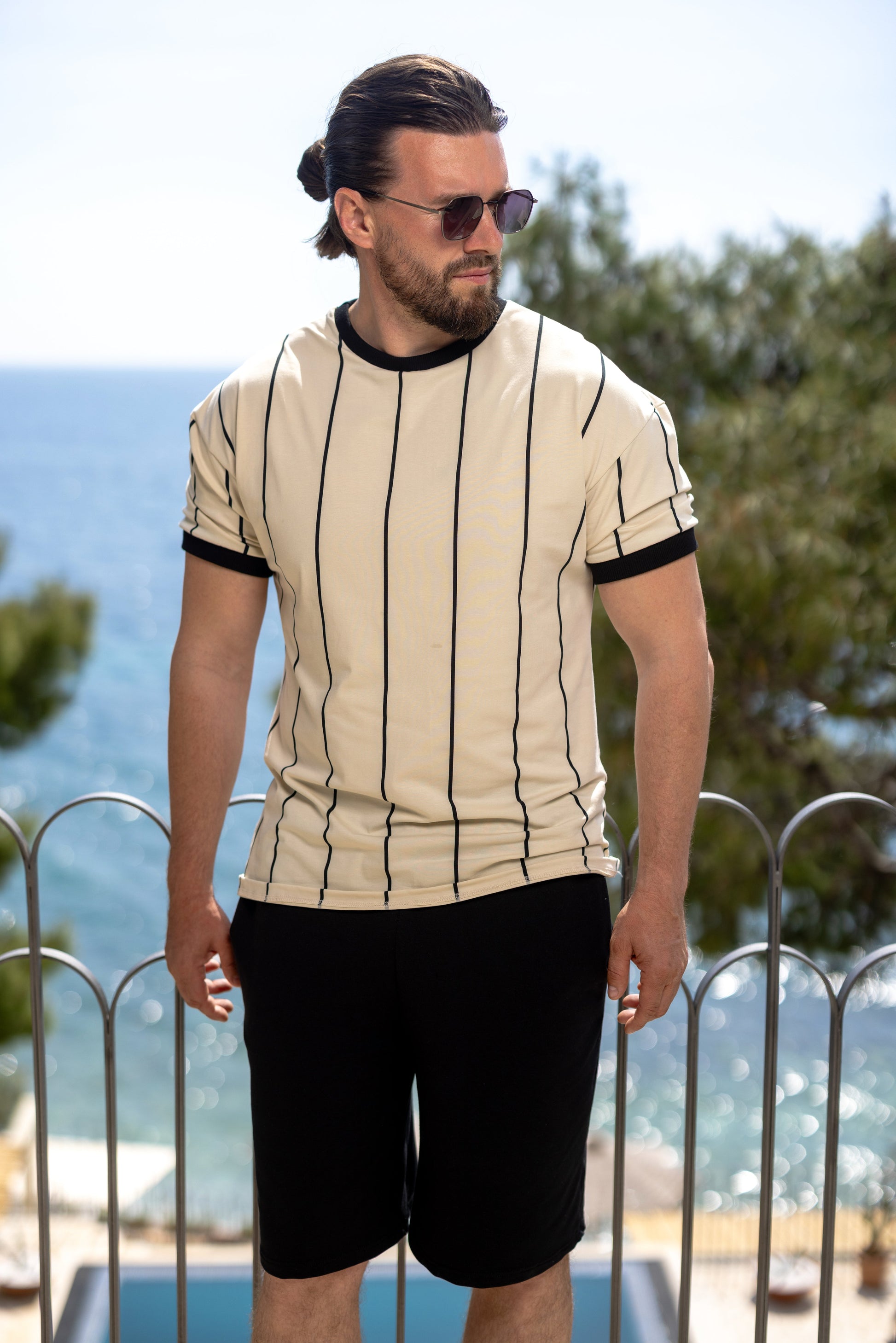 Bež osnova sa kontrastnim crnim prugama – za klasičan i elegantan izgled.