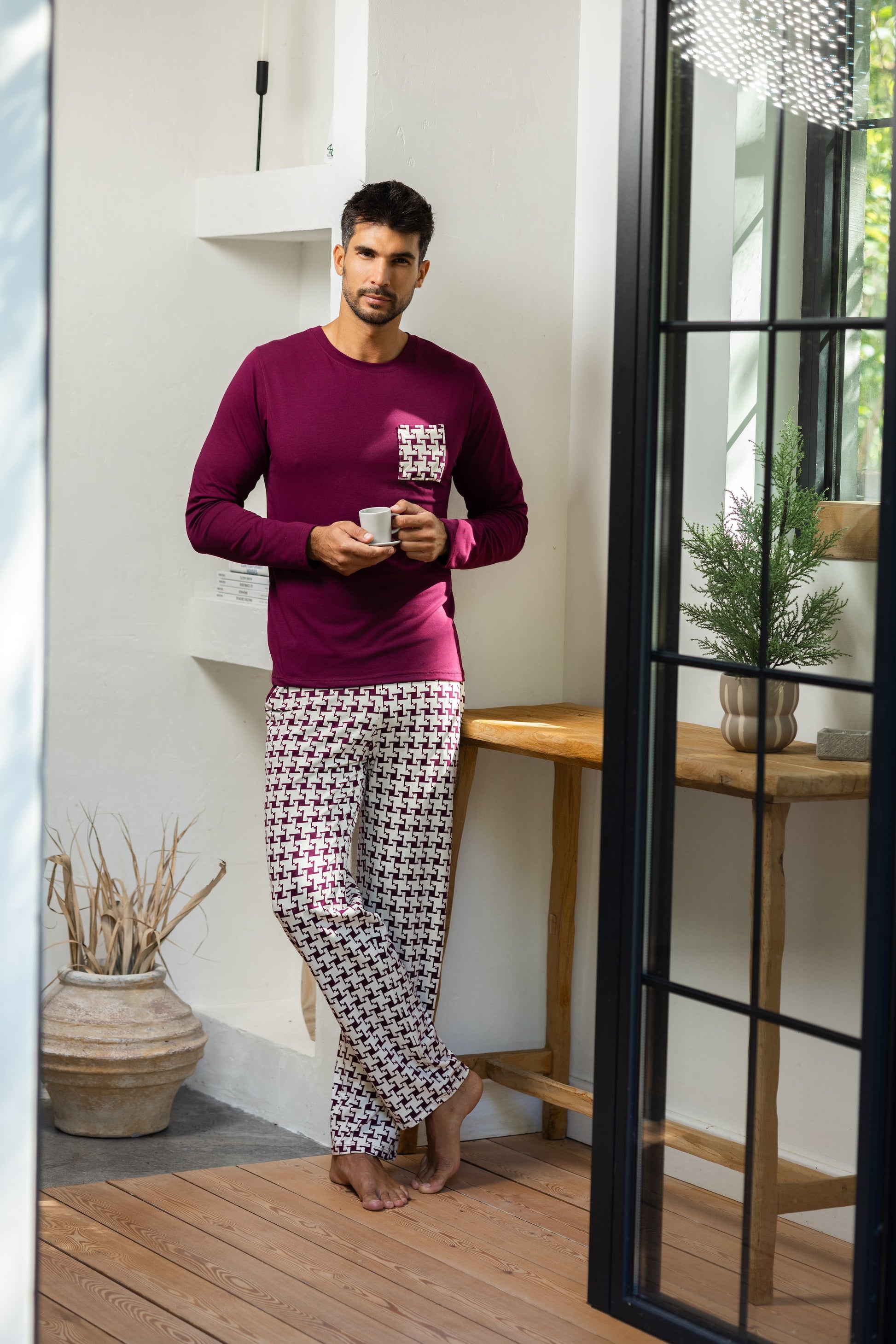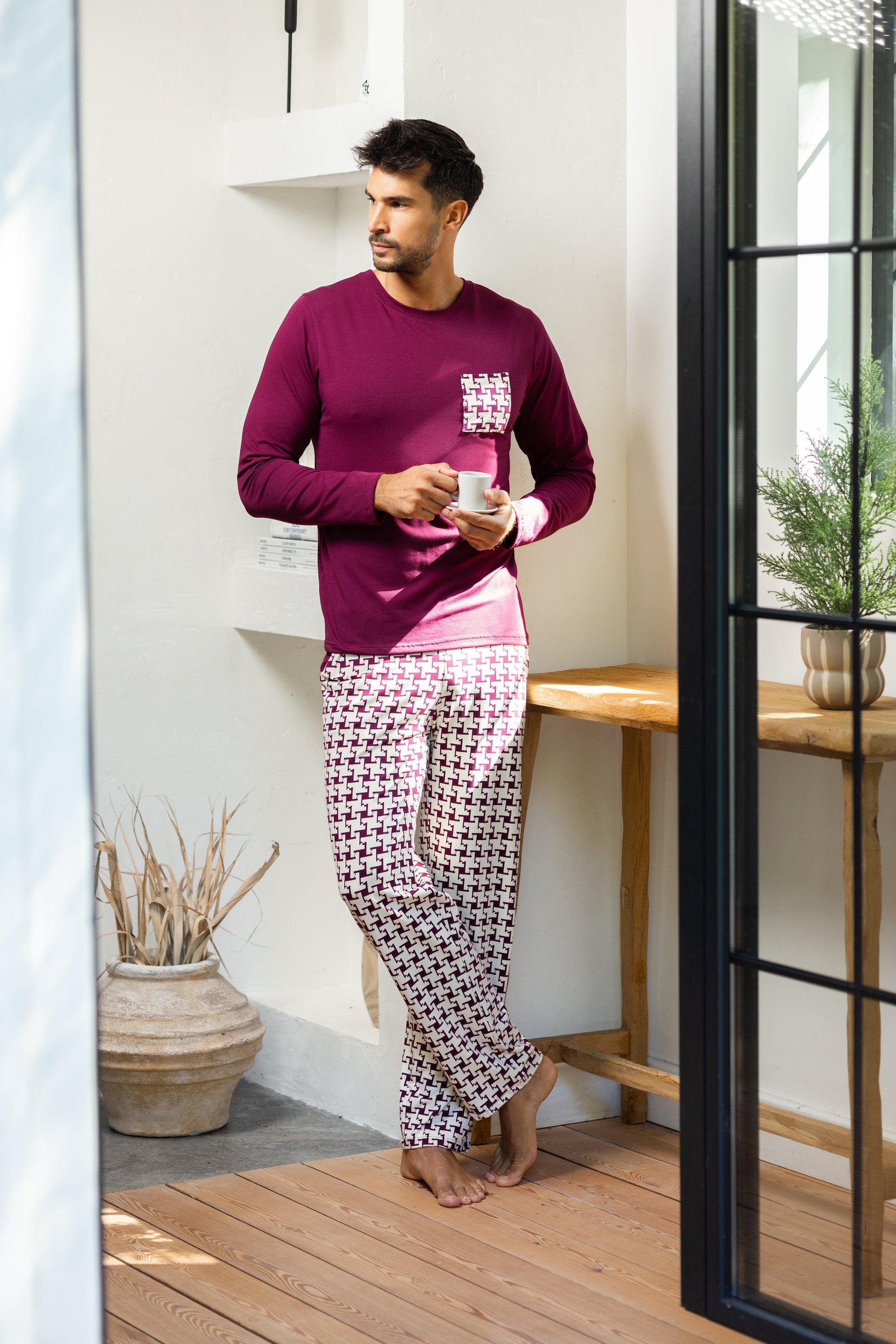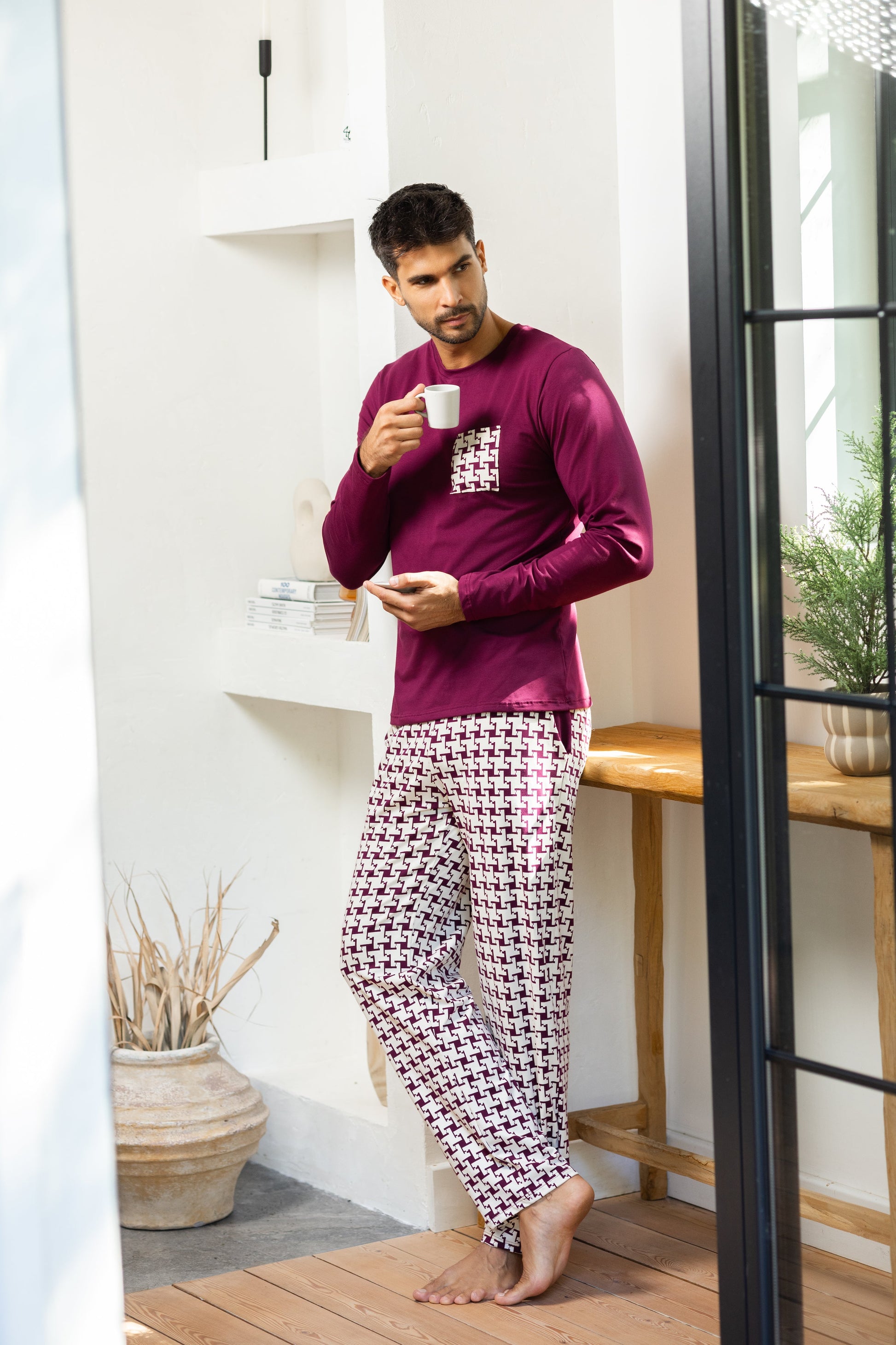 Unesite udobnost i stil u svoje večeri i jutra uz našu mušku pepito pidžamu od kvalitetnog pamuka. Elegantna kombinacija bordo majice i pepito dezena na pantalonama čini ovaj set savršenim spojem klasičnog i modernog.