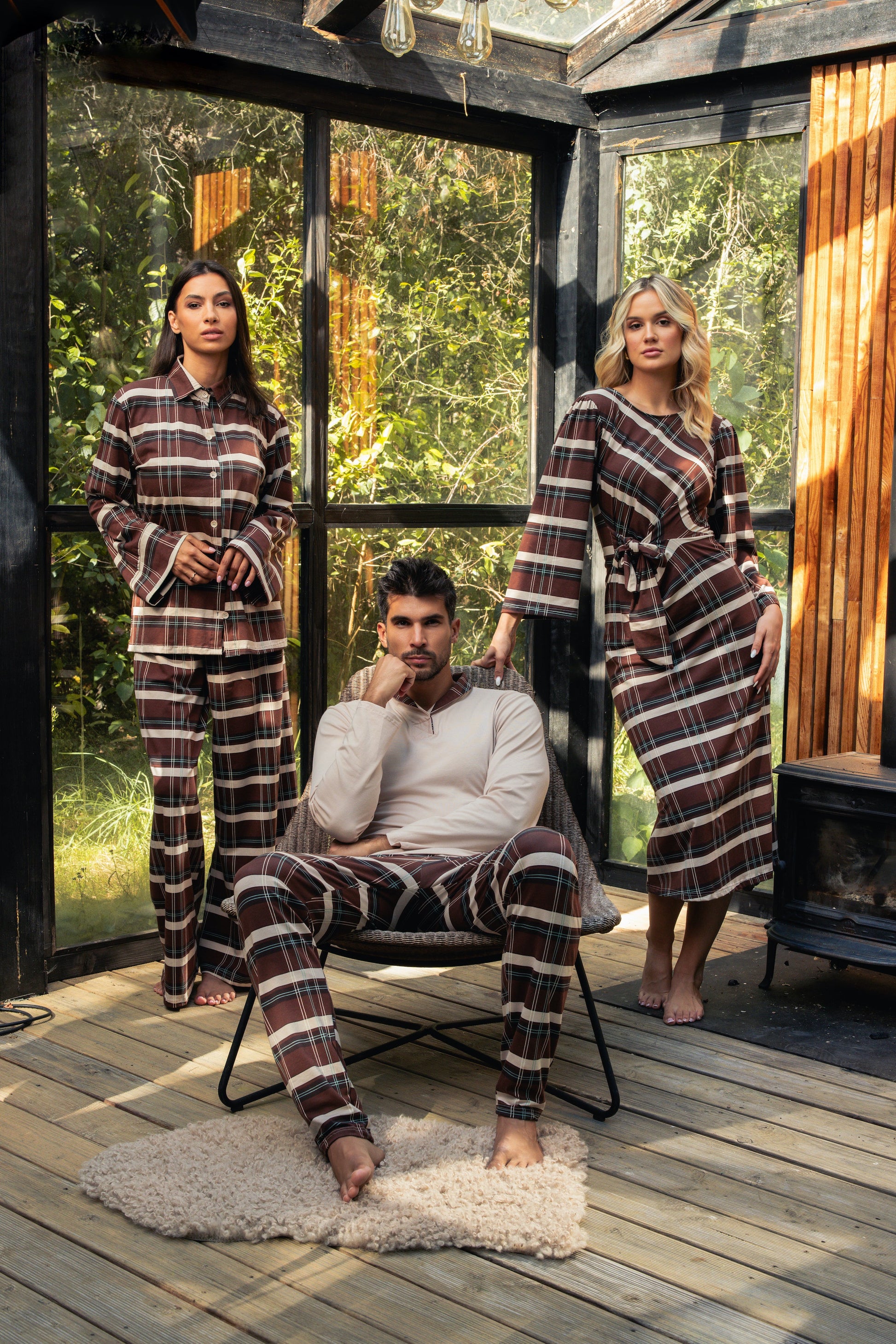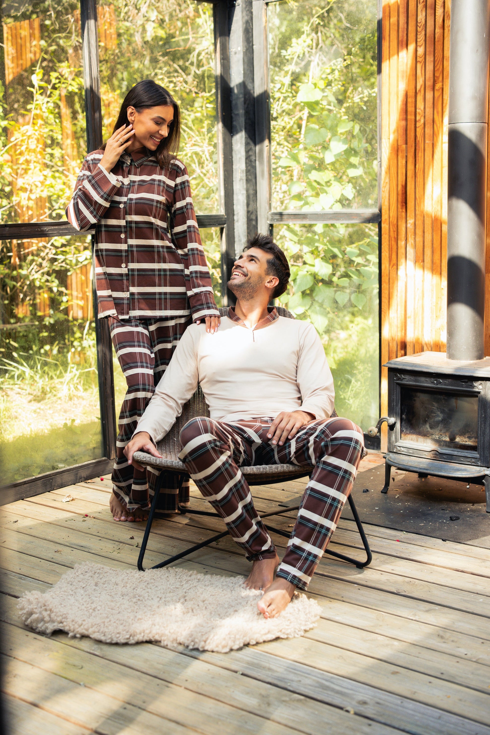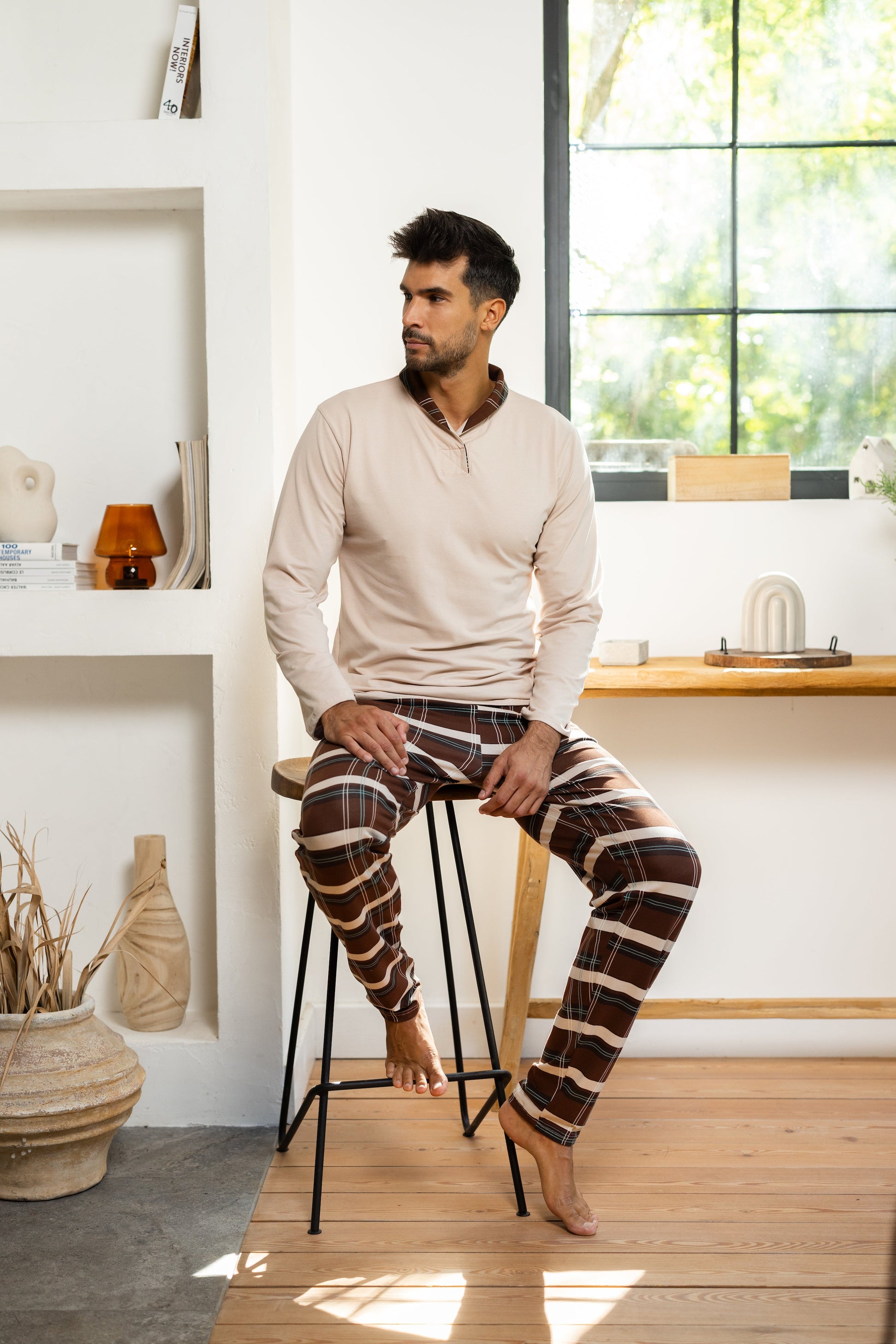 Donji deo: pantalone sa klasičnim krojem u kariranom uzorku u smeđim i bež tonovima, idealne za sofisticiran stil i opuštenost.