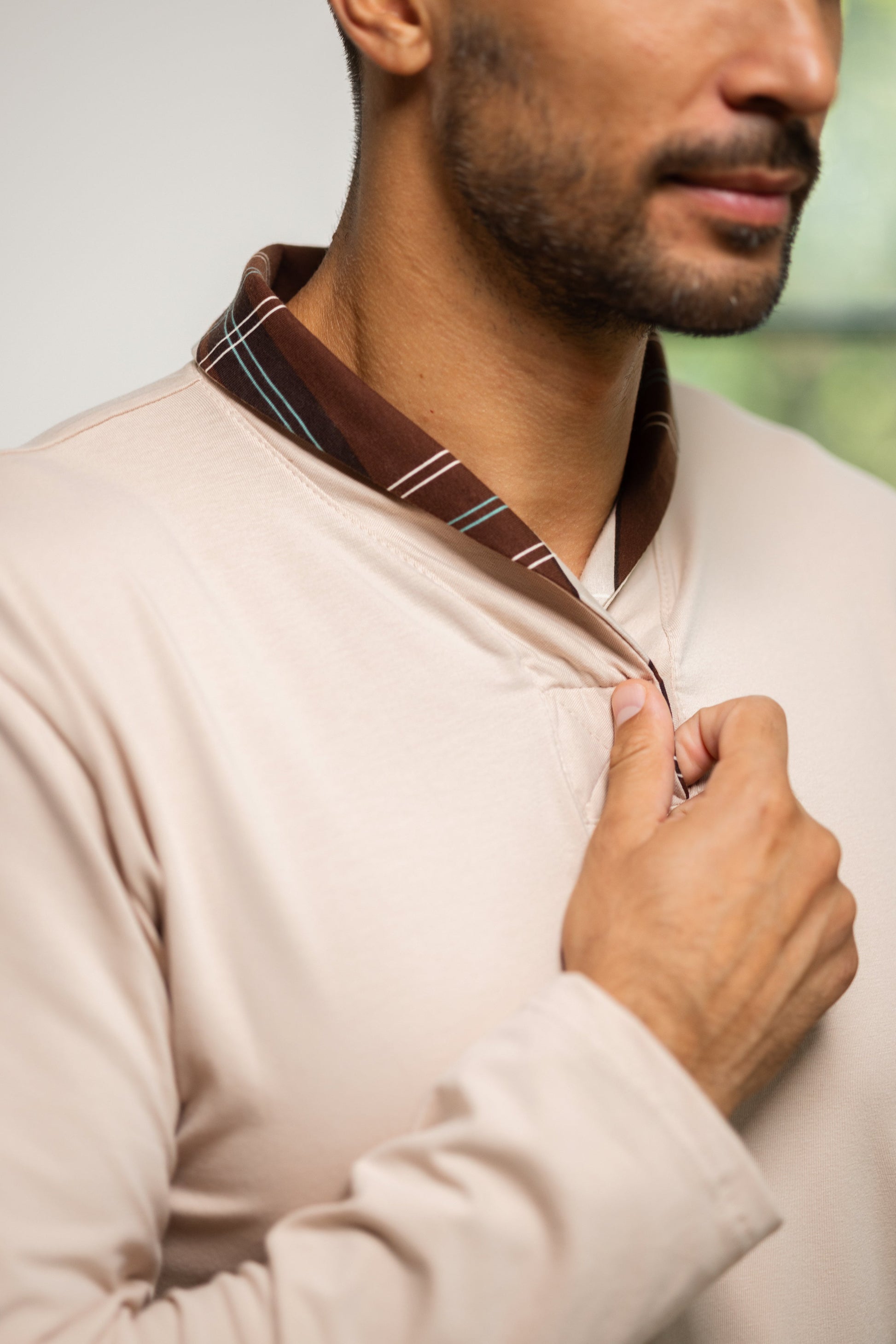 Gornji deo: bež majica dugih rukava sa elegantnim detaljem na kragni u kariranom dezenu, što daje prefinjen izgled.