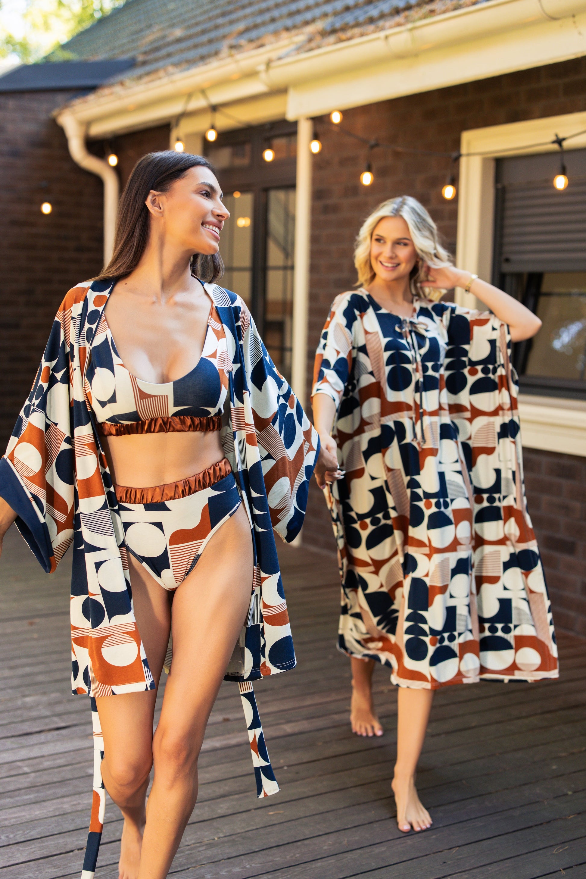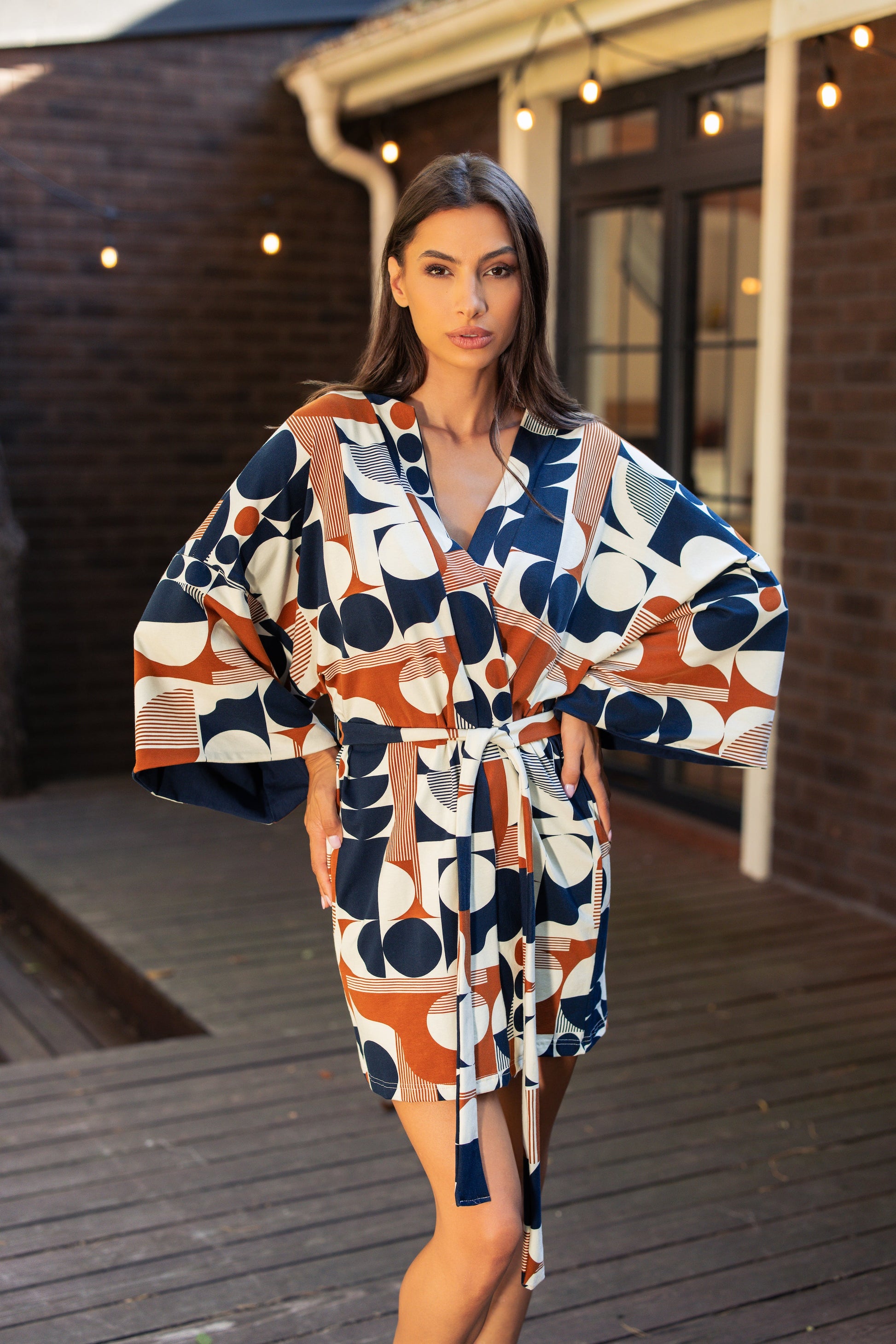 Dezen: Geometrijski print u kontrastu tamnoplave, terakota i bež tonova – moderan i upečatljiv.