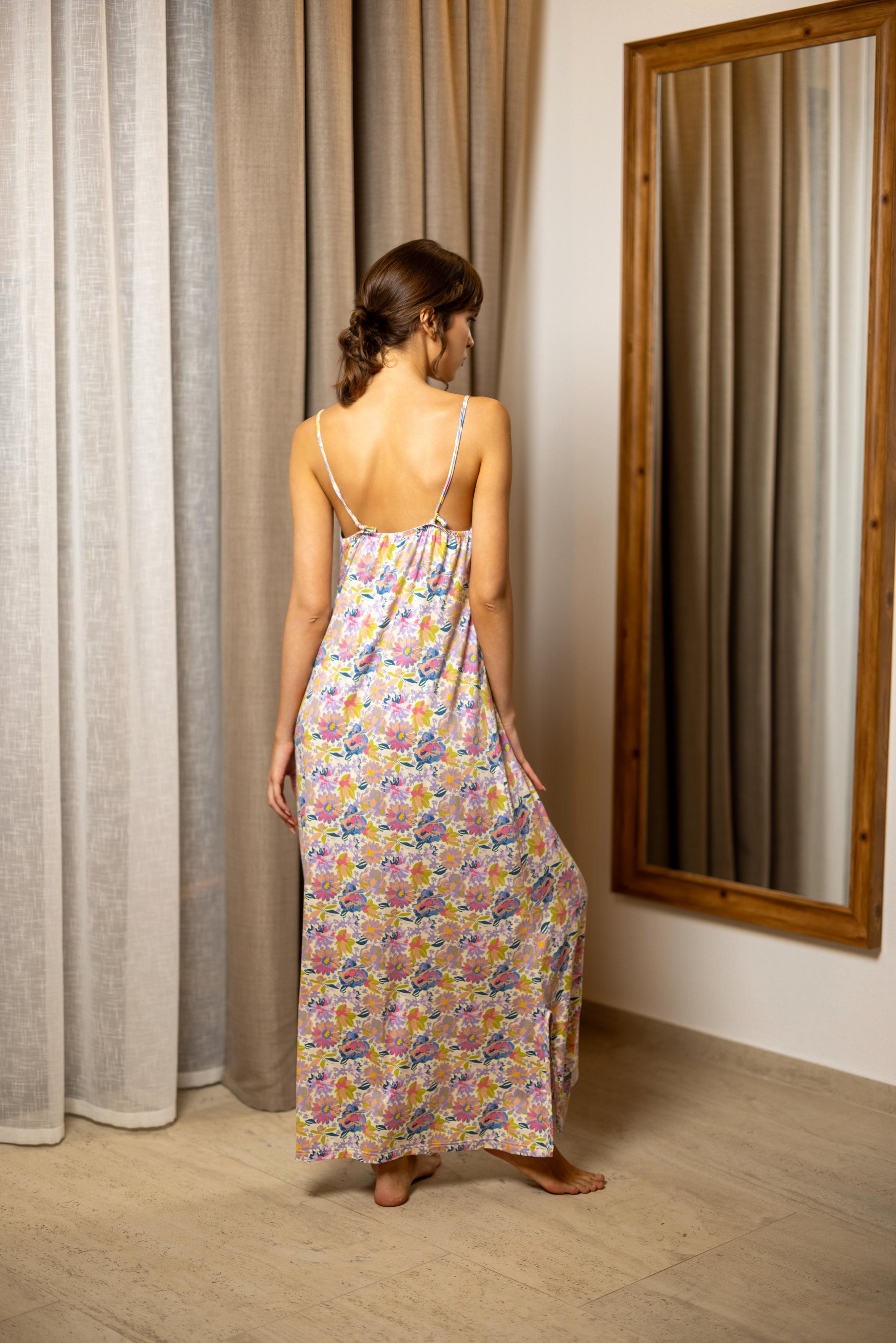 Duga spavaćica Stella odiše lakoćom i elegancijom. Izrađena od nežne viskoze sa dodatkom elastina, prijatno pada niz telo i prati siluetu bez stezanja. Dizajnirana da pruži maksimalnu udobnost tokom noći, ali i dovoljno atraktivna da se nosi kao kućna haljina tokom dana.